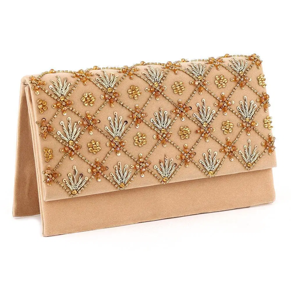 • Material: Velvet• Pattern: Embroidered• Number Of Pieces: 1 Pc• Product Feature: Wedding• Gender: Women’s• Color: Beige• Package Includes: 1 x Fancy Clutch• Note: There might be an error of 1-3 cm due to manual measurement, and slight color differences may occur as a result of varying lighting and monitor effects.